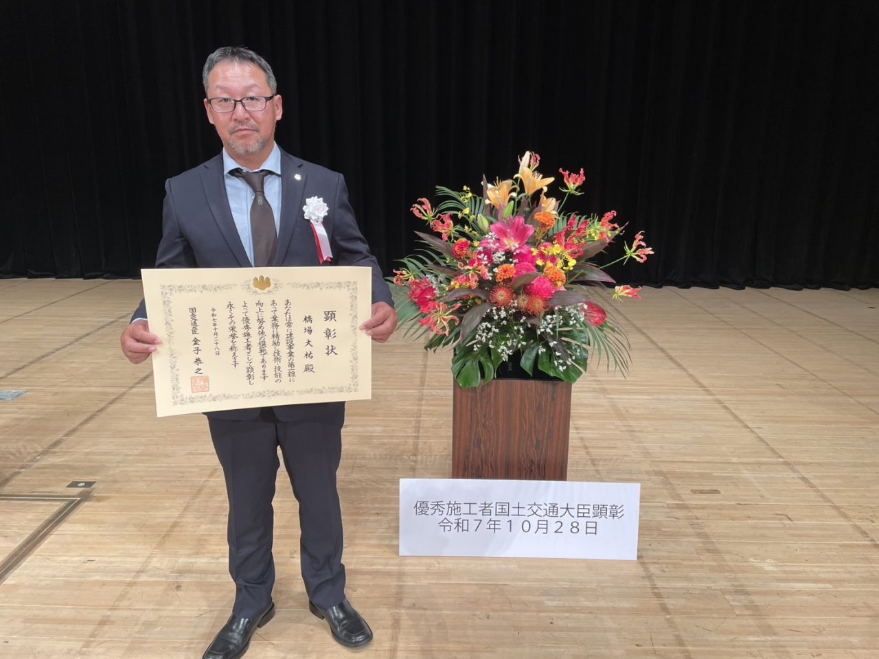 この度、弊社社員が「優秀施行者国土交通大臣顕彰(建設マスター)」を受賞いたしました。