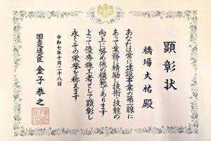 この度、弊社社員が「優秀施行者国土交通大臣顕彰(建設マスター)」を受賞いたしました。
